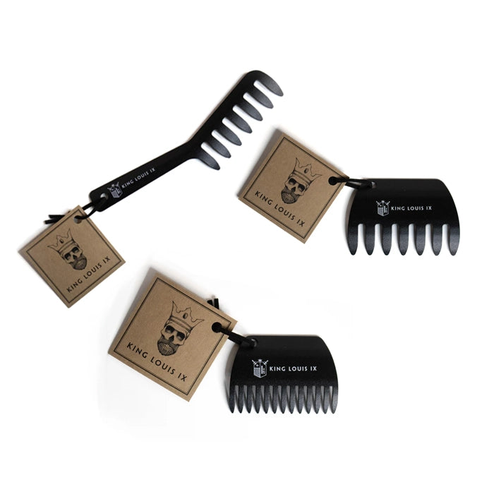 If you are a person who loves the finer things, well this one’s for you! The KING LOUIS IX BUNDLE - Here you’ll receive all three Styling tools - the Rake, The Comb and The Beard Comb. The uniqueness of the ergonomic design and positioning and angles of the teeth of our King Louis IX Styling Range is what makes it work so perfectly. You merely use it to push the hair in the direction you want. Whether is down and loose or you’re chasing height, our King Louis IX Styling Rakes and Combs has you covered. Our entire range is made from the highest quality Australian Stainless Steel and finished with a unique coating. As such, it has thermal qualities when used with a blow drier for heating and manipulating shape or cooling to lock in a style. Perfect for EDC - attach the Beard or Hair Comb to your pocket/ wallet chain and your away with a styling tool for Every Day Carry.